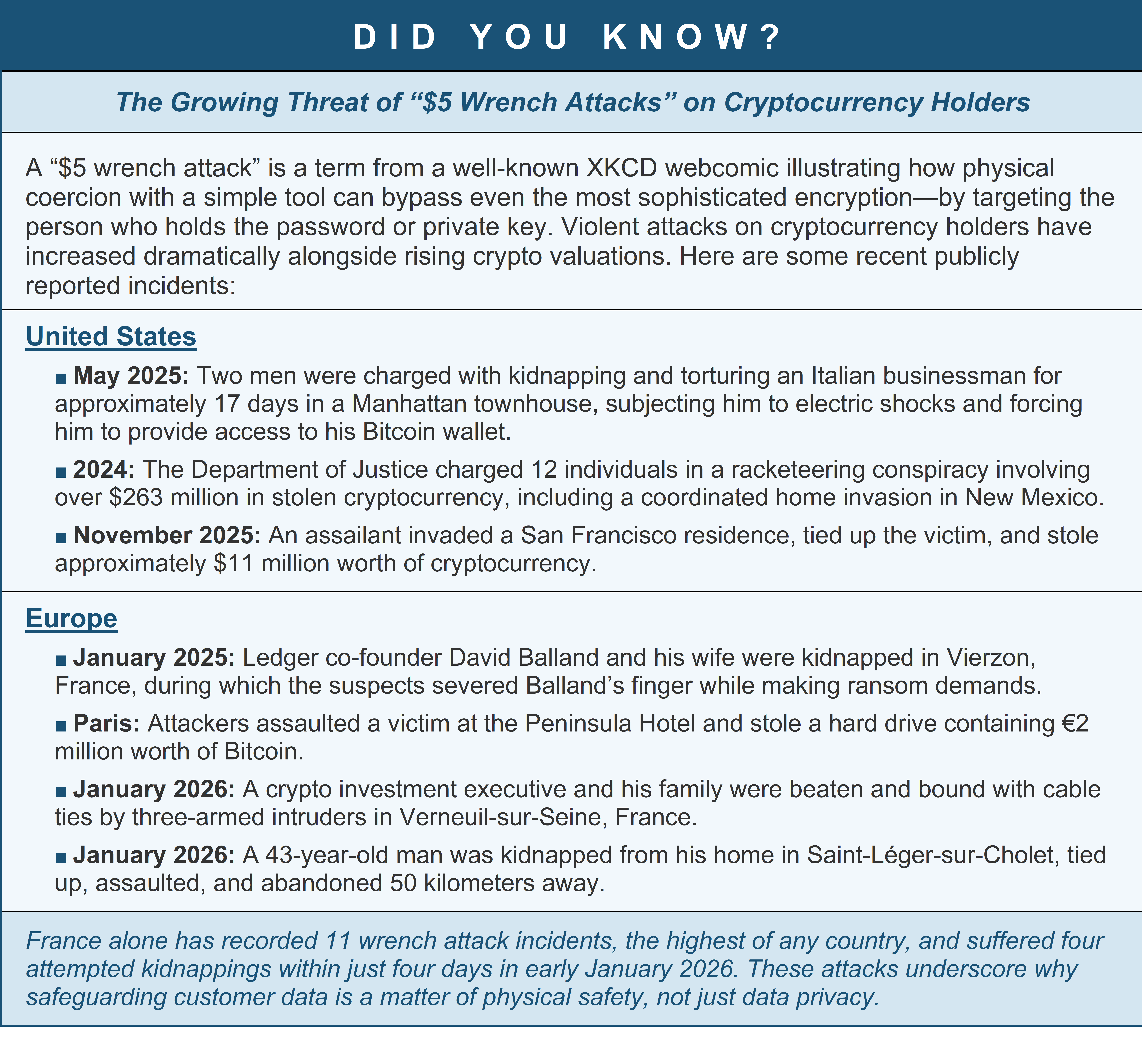This case illustrates the growing danger of violent attacks and extortion against cryptocurrency holders, and how companies have not taken these matters seriously enough. This case shows how a data breach in the cyberworld can result in real, devastating consequences, including serious bodily harm, extortion, or worse. This case also demonstrates that securing sensitive customer information is as important as securing the cryptocurrency itself. Criminals need not defeat cryptography when they can use personal information to locate and coerce a victim using old fashioned violence and extortion. For cryptocurrency exchanges that hold troves of sensitive accountholder data, this lawsuit is a reminder that security marketing claims, law-enforcement response programs, and breach-notification timelines all carry significant legal exposure when a customer’s safety is on the line.